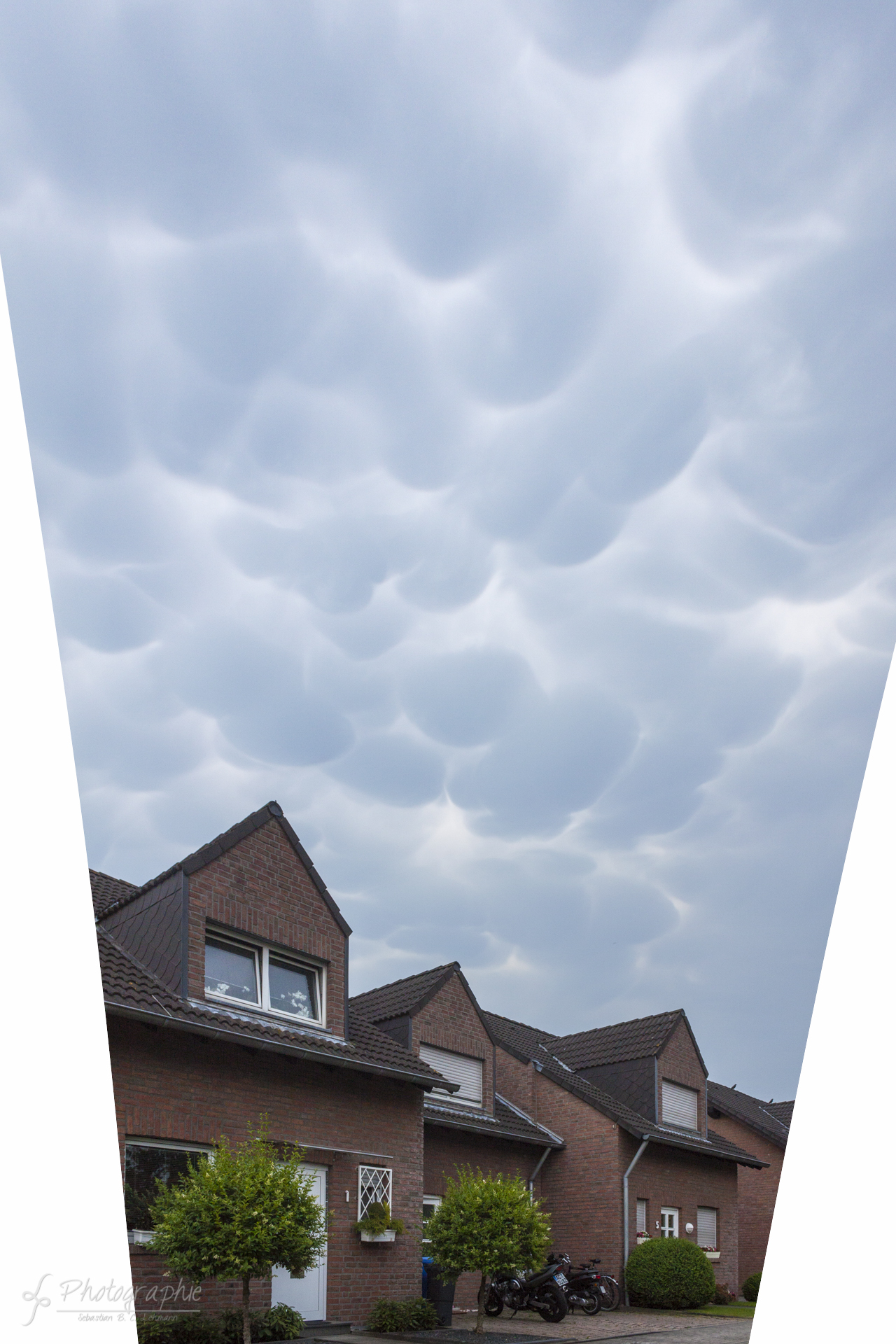 Am 9.6.2014 bildetet sich von den Niederlanden her kommend über NRW eine Gewittersuperzelle. Bevor diese Zelle über uns hereinbrach konnte man ein interessantes und in unseren Breiten sehr seltenes Schauspiel erleben. Es bildeten sich ca. 15-30 Minuten bevor das Zentrum der Superzelle auf uns traf, sogenannte Mammatus-Wolken aus. Diese können durch heiße konvektive Ströme (aufsteigende Wärmeströmung) am Rand des Eisschirms einer Gewitterformation entstehen und treten gewöhnlich eher in Äquatornähe auf. Das ganze wirkte ein bisschen wie beim Film Independence Day bevor die Mutterschiffe aus der Wolkenwand treten. Von dem eigentlichen Unwetter habe ich nur wenige Fotos, da es einfach zu heftig war und die Fenster voller Wassertropfen waren. Zu Beginn habe ich ein paar Videos gemacht und dann aus der Küche ein paar Blitze durchs Fenster fotografiert.