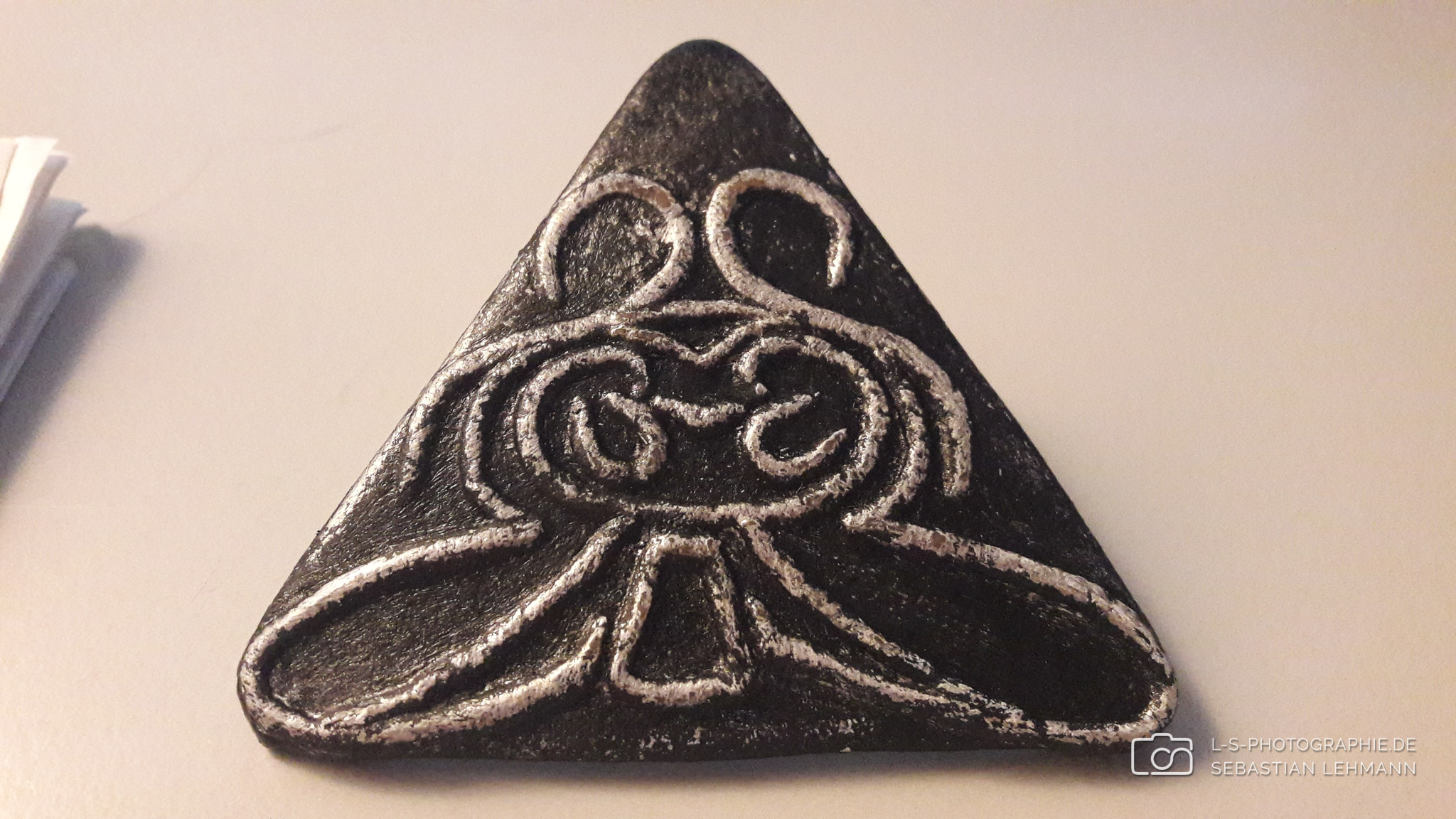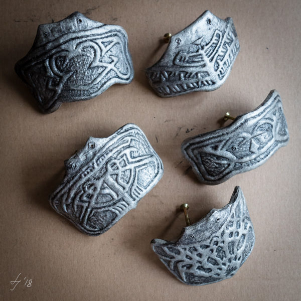 Für die Rüstungsplatten habe ich jeweils drei gleichgroße Teile mit der Schere aus der Platte herausgeschnitten. Anschließend wird ein Sandwich aus Worbla, Moosgummi und 2x Worbla gebaut. Durch Erhitzen kann alles zusammengefügt werden. Die Ornamente wurden auf der dicken Seite mit Zahnarzt-Besteck herausgearbeitet. Sollte mal etwas überstehen, so kann es einfach abgeschmirgelt werden.